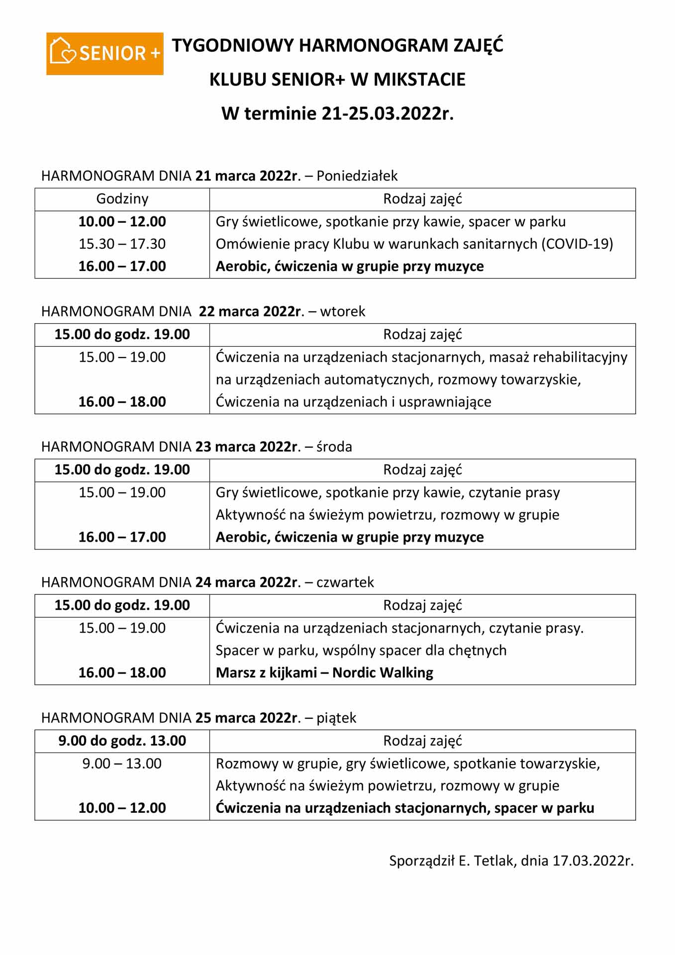 TYGODNIOWY HARMONOGRAM ZAJĘĆ KLUBU SENIOR+ W MIKSTACIE W terminie 21-25.03.2022 r.