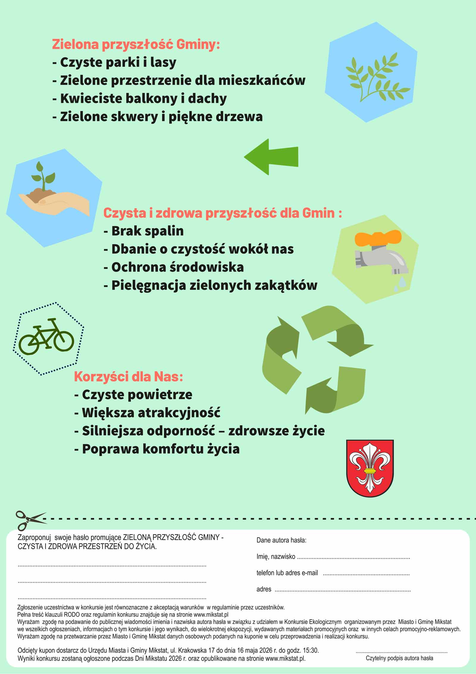 Każdy mieszkaniec Miasta i Gminy Mikstat może wziąć udział w konkursie. W tym roku hasłem promującym jest „ZIELONA PRZYSZŁOŚĆ GMINY – CZYSTA I ZDROWA PRZESTRZEŃ DO ŻYCIA”.