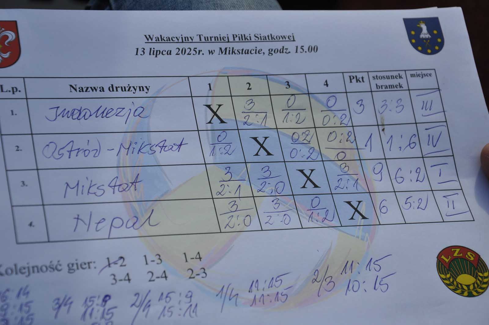 Wystartowały drużyny z Nepalu, Polski i Indonezji. Z Polski były dwie drużyny a mianowicie Mikstat i Mikstat – Ostrów. Turniej zorganizował samorząd mieszkańców Mikstatu przy współpracy z opiekunem Orlika . Po zaciętych zmaganiach złoto przypadło Mikstatowi, srebro zgarnęła drużyna z Nepalu a brązowymi medalistami okazali się zawodnicy z Indonezji. Miejsce IV przypadło zespołowi „Mikstat – Ostrów” Sędziami poszczególnych meczów byli panowie Tomasz Kowalczyk i Paweł Szóstak, sędzią technicznym był pan Edmund Tetlak, serwis fotograficzny zapewnił pan Jacek Sikora. Warto nadmienić, iż ta trzy godzinna impreza przebiegła w bardzo miłej i przyjacielskiej atmosferze, tak jak powinno być.