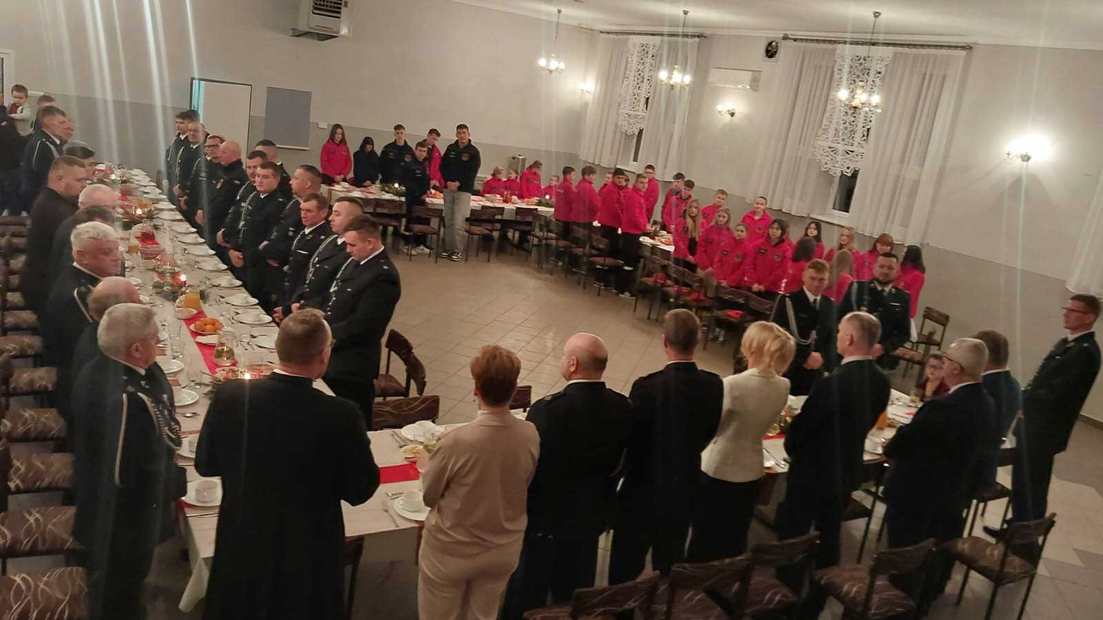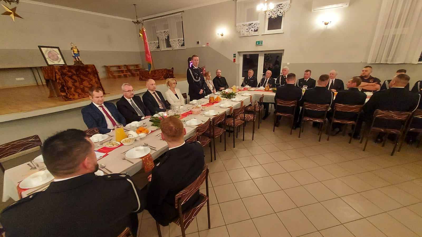 Wspólną modlitwę poprowadził ks. Szymon Grzeszkiewicz- Proboszcz miejscowej Parafii- który udzielając błogosławieństwa podkreślił w swoim słowie znaczenie służby bliźniemu, poświęcenia oraz strażackiej wspólnoty. Po wspólnym odśpiewaniu kolędy nastąpiło łamanie opłatkiem i tradycyjny poczęstunek. W czasie uroczystości obdarowano zebrane drużyny MDP i DDP paczkami świątecznymi.