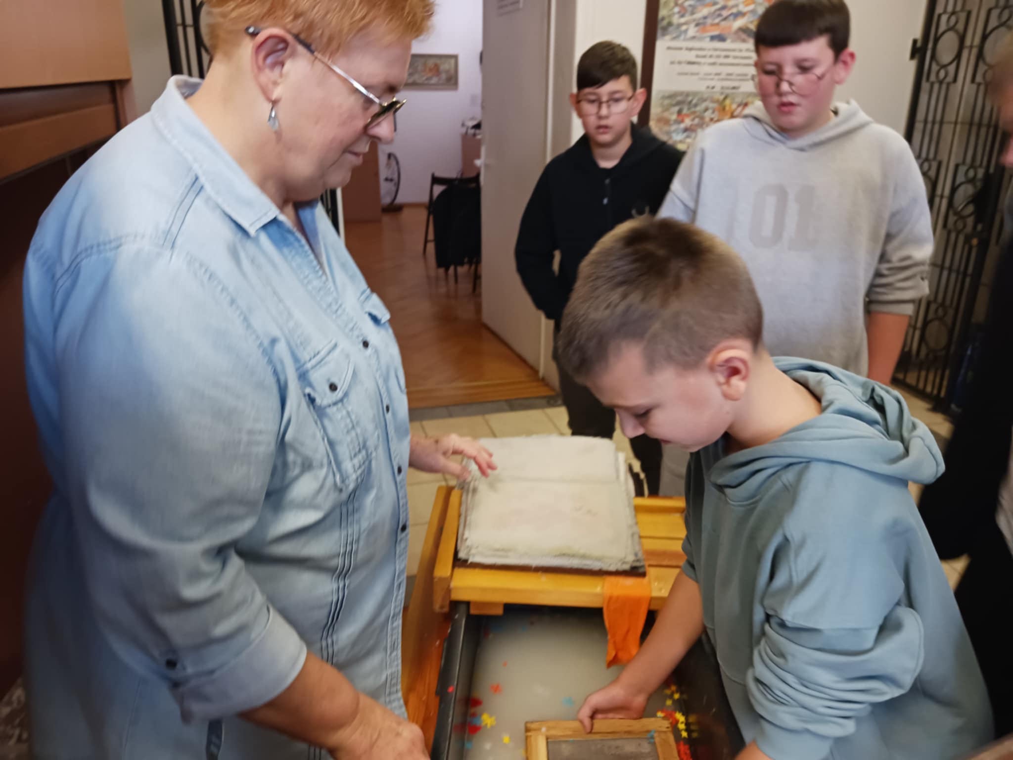 Kolejnym punktem programu był udział w warsztatach czerpania papieru. Uczniowie z zaciekawieniem słuchali opowieści o historii papiernictwa a potem z zaangażowaniem wyrabiali własne kartki papieru.